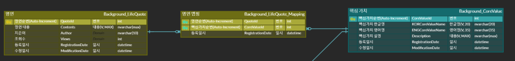 여러 명언에는 여러 가지 핵심 가치들이 있을 수 있습니다. 또 여러 가지 핵심 가치에는 여러 가지 명언이 있을 수 있습니다. 두 Entity를 연결해 주는 맵핑 Entity를 생성하여 2개의 Entity의 고유 속성을 가져와 연결합니다.